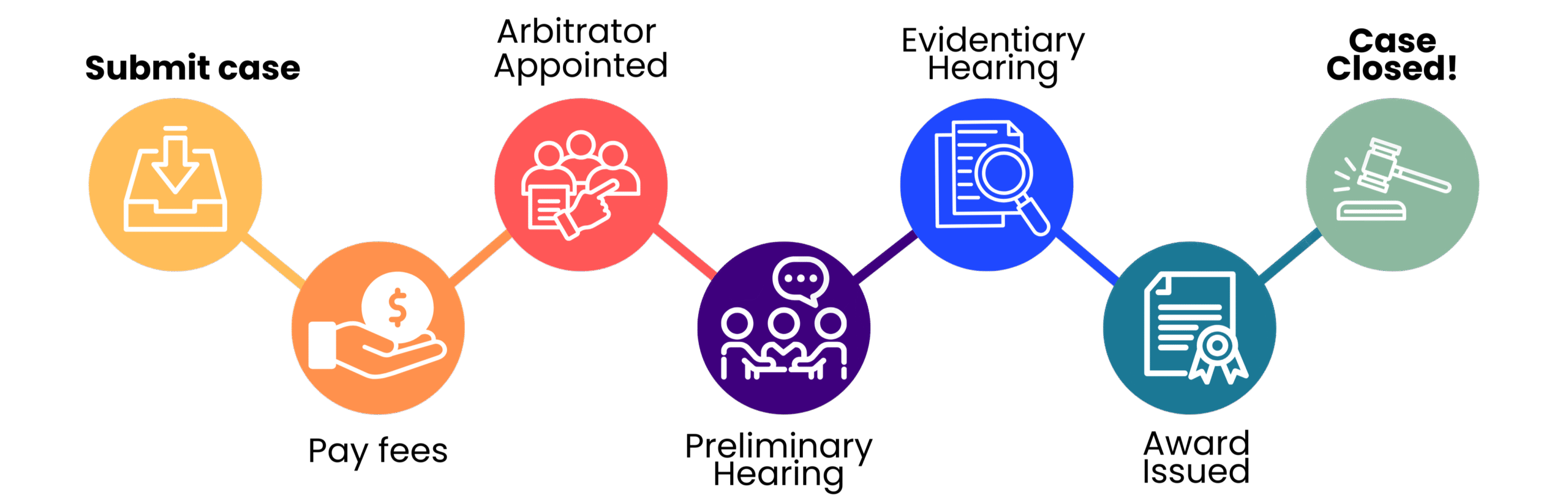 6. Award Issued – If post-hearing filings are needed, the case closes within 7 calendar days after the last submission. The arbitrator then issues the award within 30 calendar days after the case closes.